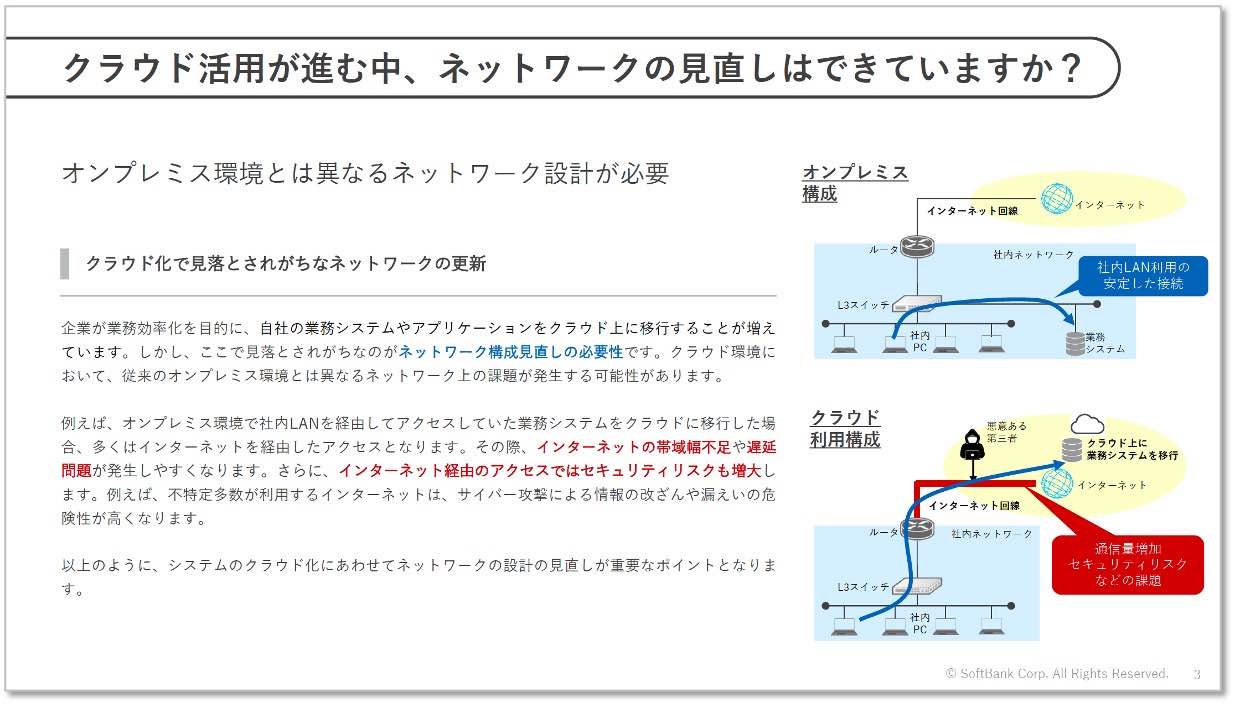 企業が自社の業務システムやアプリケーションをクラウド上に移行することが増えています。クラウドに移行する上で見落とされがちなものが「ネットワーク構成見直し」です。クラウドに移行することで、オンプレミスとは異なる課題が発生する可能性があるため、ネットワーク設計も含めた検討が必要です。 本資料では、クラウド移行に伴って発生しがちな課題と、その解決策をご紹介します。ぜひダウンロードをして業務にお役立てください。