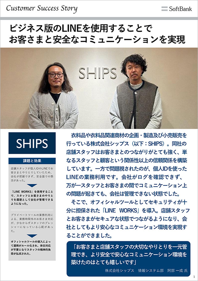 衣料品や衣料品関連商材の企画・製造及び小売販売を行っている株式会社シップス(以下:SHIPS)。同社の店舗スタッフはお客さまとのつながりがとても強く、単なるスタッフと顧客という関係性以上の信頼関係を構築しています。一方で問題視されたのが、個人IDを使ったLINEの業務利用です。会社がログを確認できず、万が一スタッフとお客さまの間でコミュニケーション上の問題が起きても、会社は管理できない状態でした。 そこで、オフィシャルツールとしてセキュリティが十分に担保された「LINE WORKS」を導入。店舗スタッフとお客さまがセキュアな状態でつながるようになり、会社としてもより安心なコミュニケーション環境を実現することができました。