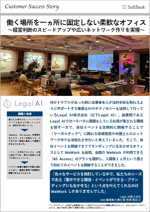 何かトラブルがあった時に当事者本人が法的手段を取れるようにサポートする事業をAIやテクノロジーを活用して行っているLegal AI株式会社(以下Legal AI)。創業期であるLegal AIではバラバラに業務をしている社員が集まれる環境を探す一方で、自社イベントを定期的に開催することで「リーガルテック※」に関わる情報発信や弁護士とのネットワーク作りを活性化させたいと考えていました。そこで、自社イベントを開催できてブランディングにも生かせるオフィスとしてWeWorkを採用。全国のWeWorkが利用できる「All Access」のプランを選択し、入居後1ヵ月という速さで初めてのイベントを開催することができました。